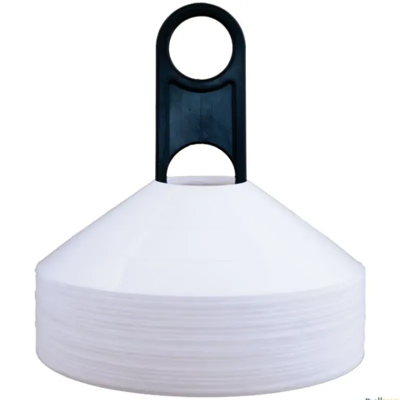 Conjunto de 40 conos flexibles medio en color blanco (ideales para entrenamientos sobre césped), con barra para el almacenamiento y transporte. Fabricados en plástico flexible, ofrece una alta seguridad en su uso.