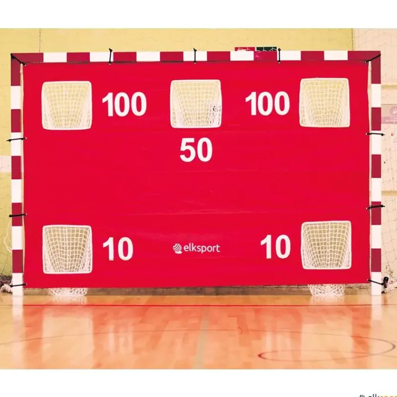 Diana para portería de balonmano y fútbol sala, para trabajar la precisión de los lanzamientos. Fabricada en PVC con 5 orificios (4 esquinas y 1 central). Se ajusta a postes y larguero mediante 11 elásticos de sujeción rápidos incluidos. Existe una red detrás de cada orificio de la diana para facilitar la recogida de los balones.