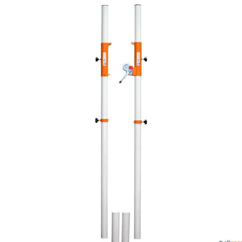 Juego de postes fijos fabricados con tubo metálico de sección redonda de 80 mm de ø, con escala numerada para 8 alturas de voleibol, bádminton, tenis y pádel. Cabestrante exterior zincado para el tensado de la red y poleas superiores para alojamiento de la sirga de la red sobre casquillo metálico corredero para fijar a la altura deseada mediante pomo roscado. Anclajes y tapas incluidos.