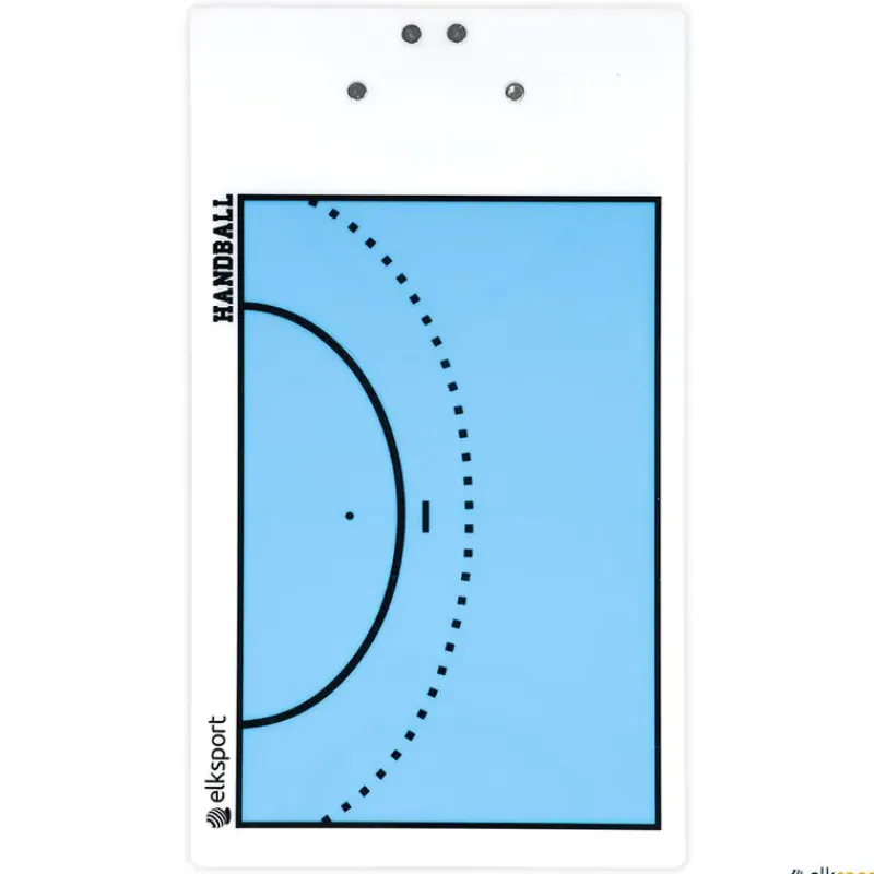 Pizarra rígida táctica para balonmano y fútbol sala, se puede usar por ambas caras: campo completo y medio campo. Incluye un rotulador de tinta borrable.