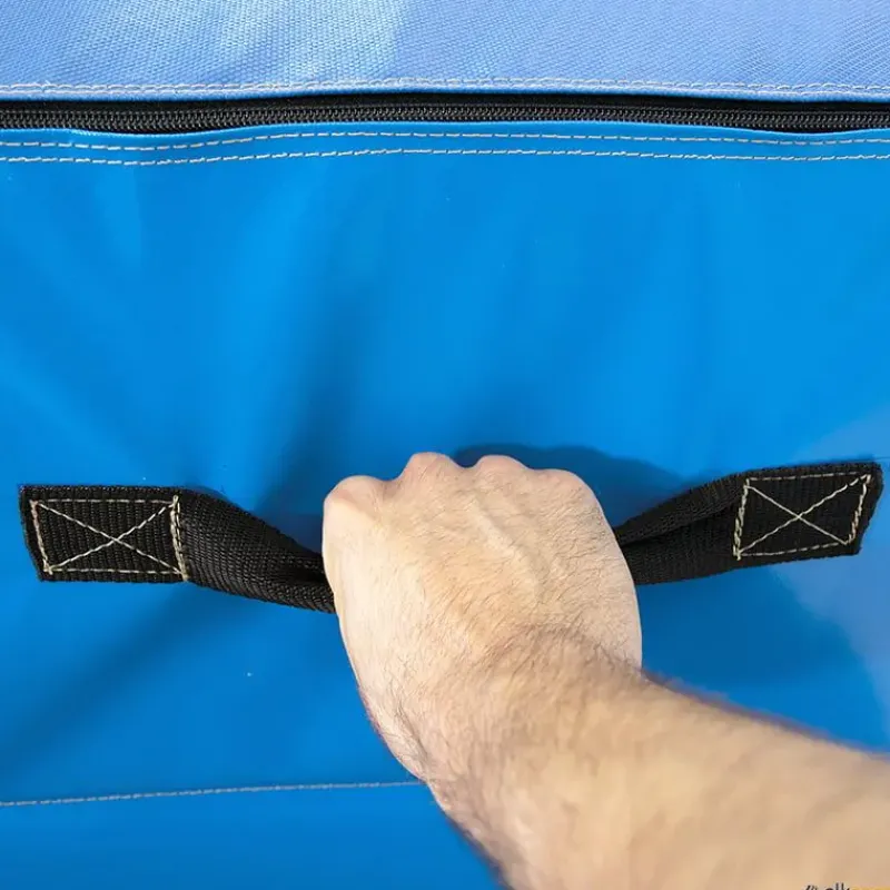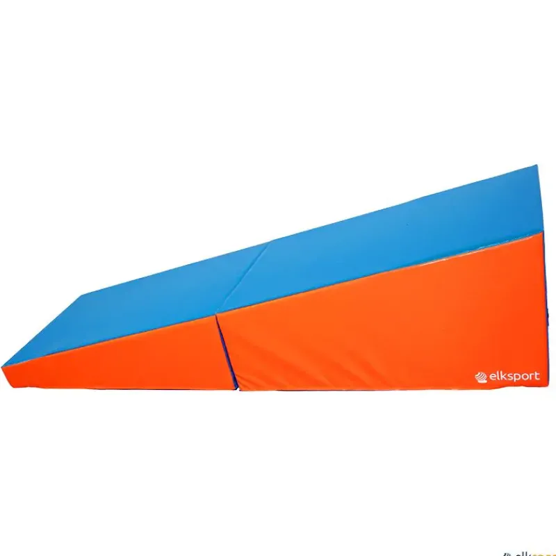 Plano inclinado plegable de espuma forrada cosida que puede utilizarse como plano inclinado para volteretas, etc. o plegándolo, formado un módulo de espuma que permite realizar nuevos ejercicios y optimizar el almacenamiento. Con asas para facilitar su transporte y base antideslizante.