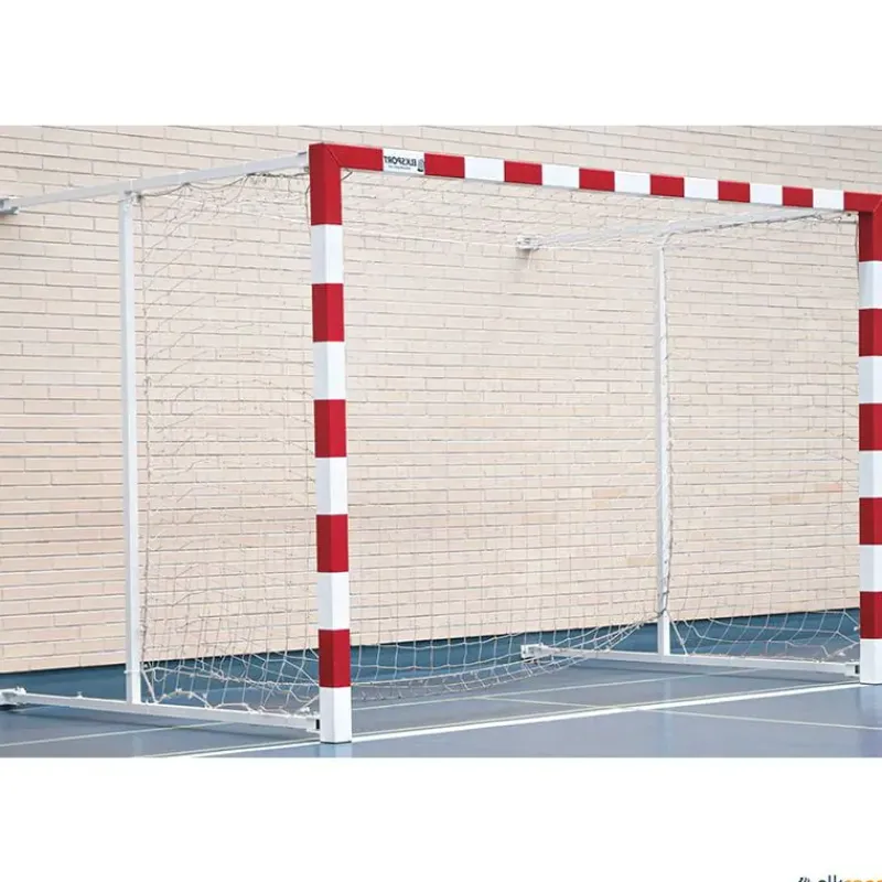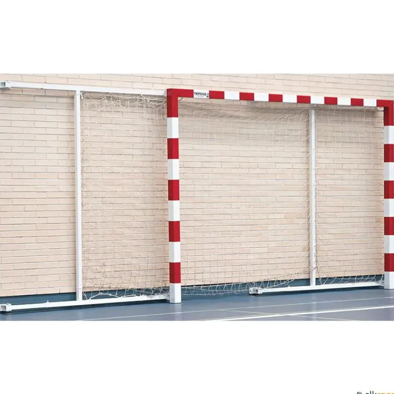 Portería para fútbol sala y balonmano con arquillos metálicos abatibles telescópicos para plegado lateral. Fabricada en perfil metálico de 80 x 80 mm. Especificar longitud de abatimiento. Incluye ganchos para sujeción de red. No incluyen red.