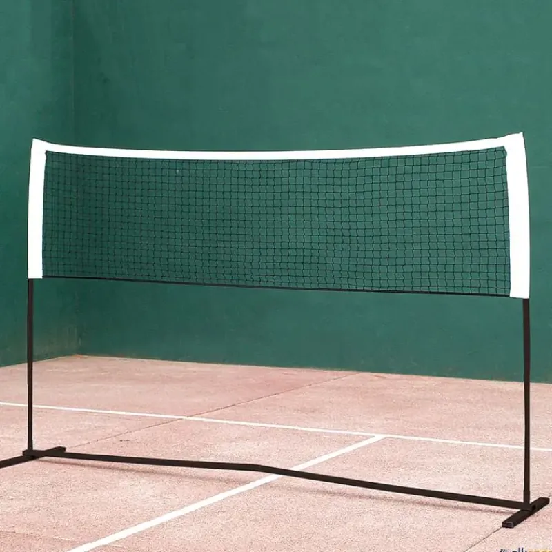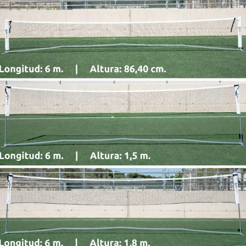 Red portátil fabricada con una estructura de acero que le aporta mayor rigidez con un número menor de piezas. Cuenta con un sistema que le permite ser regulable en altura (86,4 m ó 1,5 m ó 1,8 m) y regulable en longitud (3 m ó 6 m). Se monta en unos minutos y mantiene la red perfectamente tensa en todas las alturas. Dos usuarios pueden fácilmente desplazarla montada donde se necesite o desmontarla cuando acabe la actividad. Incluye 2 redes de gran calidad (3 m y 6 m) y una bolsa para transportar todo el sistema.