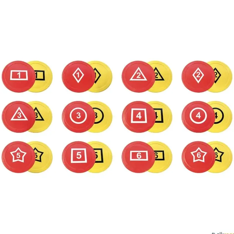 Estos discos te permiten configurar el juego relevos de memoria de diferentes maneras, por ejemplo: los discos están boca abajo, de manera que no se vea ni el número ni la forma dibujada en ellos, el primer jugador corre y levanta un disco y se lo muestra a su equipo, a continuación, lo vuelve a poner en el suelo con la forma y número hacia abajo. Los siguientes jugadores intentan encontrar el doble de ese disco (por el número o por la forma). Cada relevista sólo puede levantar 1 ó 2 discos, pero si no tienen el mismo número o forma, deberá poner ambos boca abajo. El equipo gana si se han encontrado todas las parejas de discos y se han llevado al lugar de salida donde está el equipo.