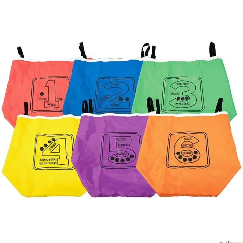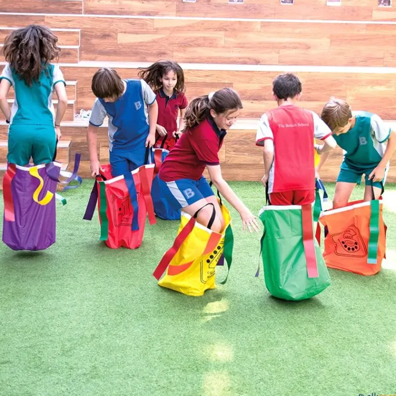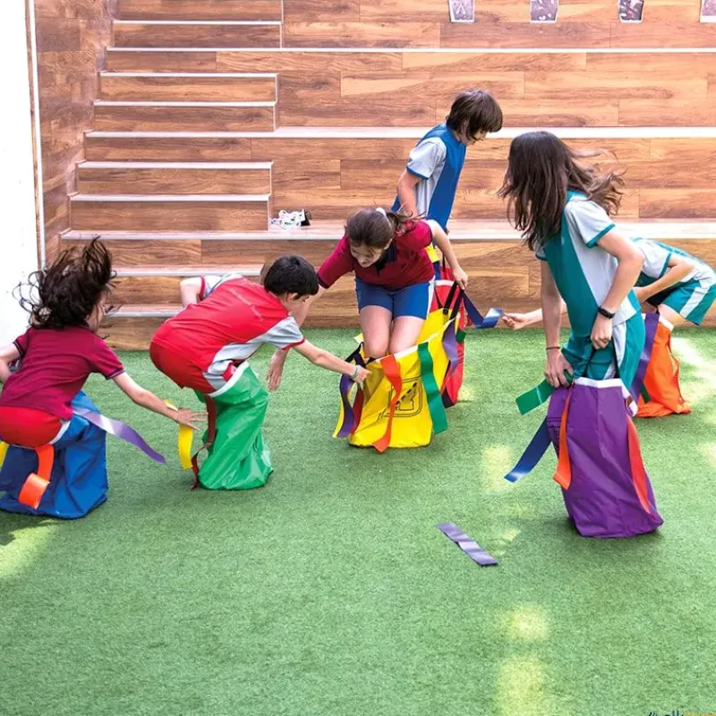 A los ya populares sacos polivalentes, les hemos añadido cintas de material muy resistente, para aumentar las posibilidades de juego mientras te desplazas saltando con ellos. La actividad más básica sería ir a quitar las cintas que tienen los otros jugadores sin que te quiten las tuyas, pero hay muchas otras posibilidades. Las cintas vienen en los 6 colores de los sacos por lo que cada saco puede llevar 6 cintas de su mismo color o 6 diferentes, de este modo las reglas, puntuaciones, etc. pueden ser más variadas y aumentando así las actividades y la diversión.
