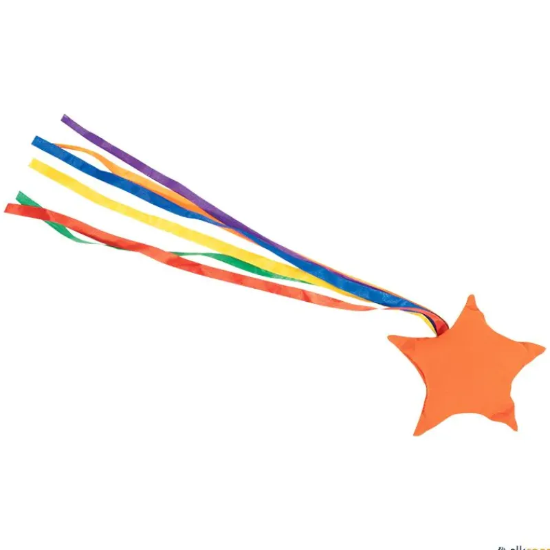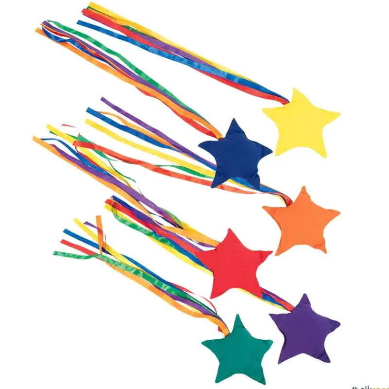Conjunto de 6 saquitos en forma de estrella a los que se ha añadido una colorida cola de cintas, para hacer más visible el lanzamiento y facilitar la recepción. Fabricados en tela de algodón.