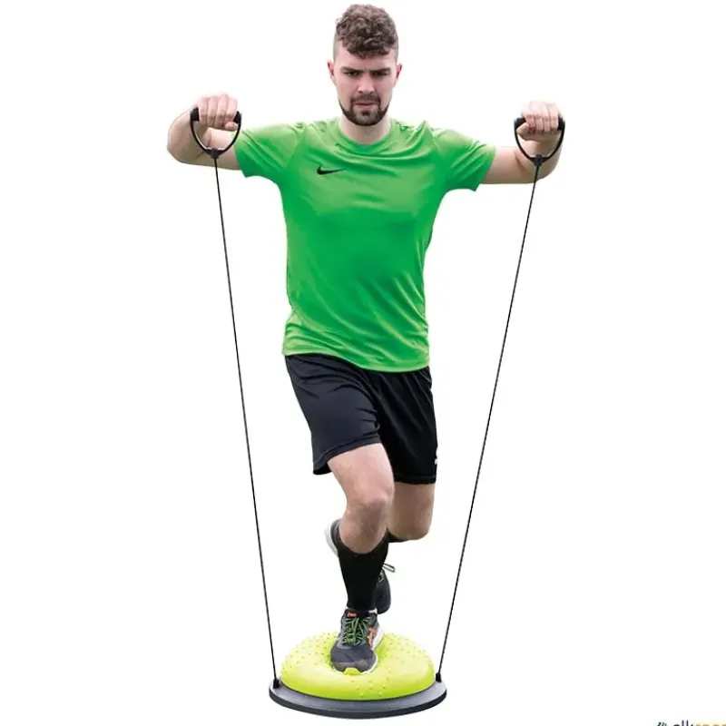 La semiesfera Pro es un instrumento fantástico para realizar ejercicios de propiocepción, movimientos de coordinación, activar y reforzar zonas musculares esenciales para la estabilidad, así como para trabajos de rehabilitación. La semiesfera de equilibrio incluye dos gomas elásticas de tubo, que amplían las posibilidades de entrenamiento. Las gomas se pueden desmontar con facilidad. Incluye bomba de hinchado.