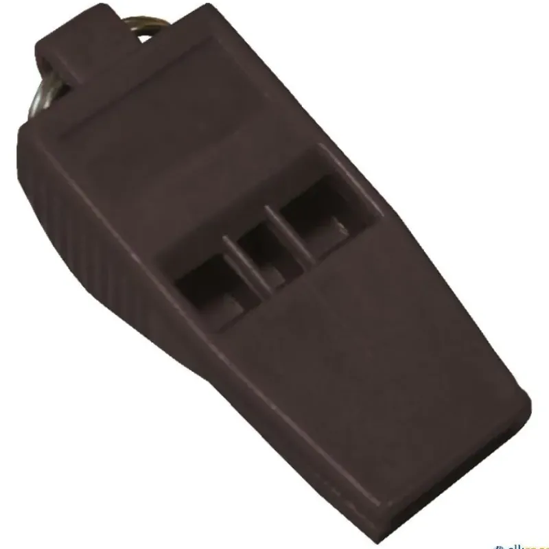 Caja con 12 silbatos en color negro fabricados en una única pieza de plástico sin partes móviles.