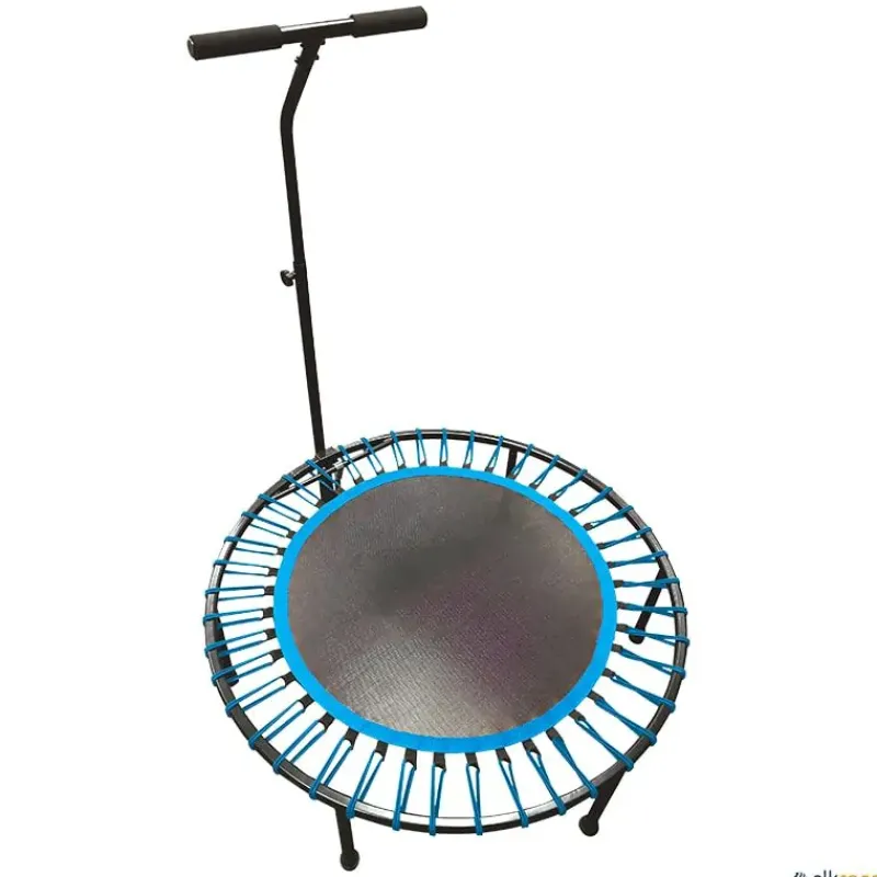 Trampolín de fitness con mecanismo de fijación patentado. Único diseño, con calidad asegurada. Sus gomas de caucho natural proporcionan unos excepcionales botes. La barra para sujetarse, se puede graduar en tres alturas para adaptarla al deportista. Fácil instalación. Certificado TUV/GS.