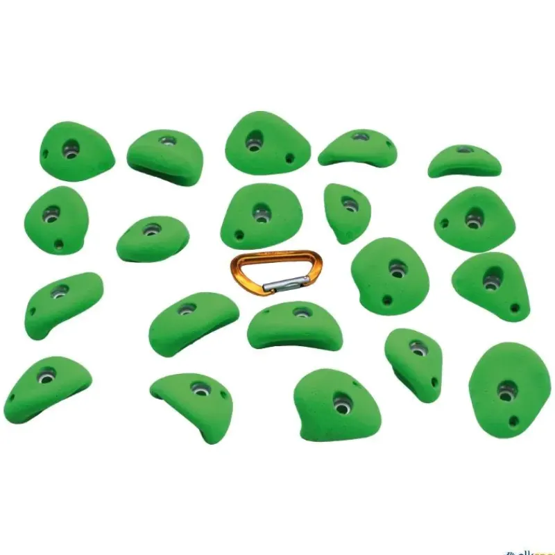 Colección de 20 presas de escalada infantiles en tamaño medio diseñadas para iniciar a los más jóvenes a la escalada gracias a sus muy buenos agarres. Para equipar travesías horizontales o verticales. Presas certificadas acorde normativa EN1176-1.