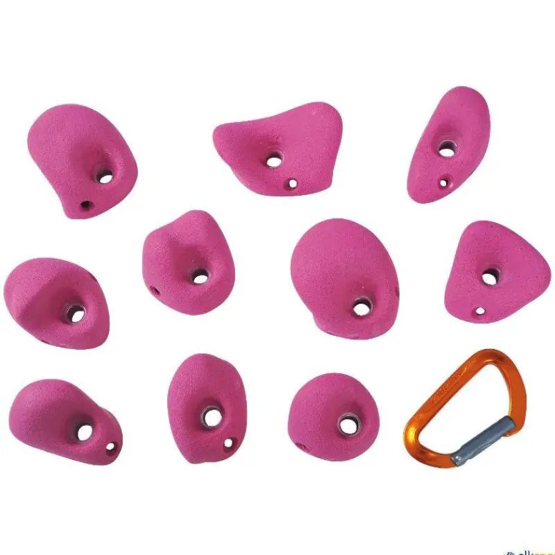 Colección Toe de 10 presas de escalada infantiles en tamaño medio diseñadas para iniciar a los más jóvenes a la escalada gracias a su magnífico agarre. Para equipar travesías horizontales o verticales. Presas certificadas acorde normativa EN1176-1.