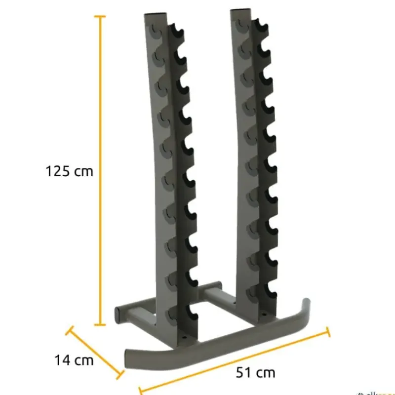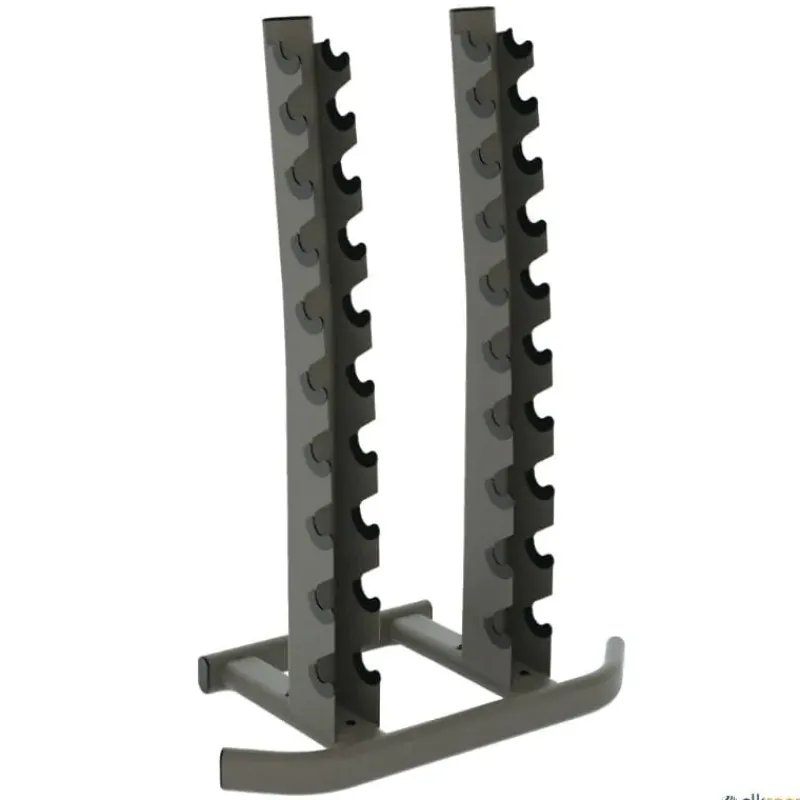 Estantería para almacenar mancuernas verticalmente.