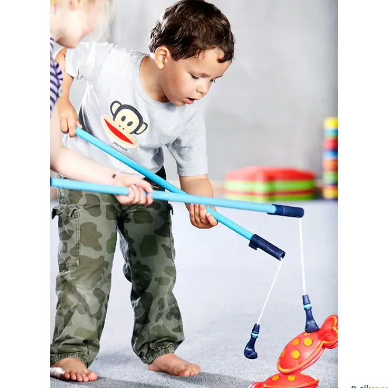 Con esta caña de pescar de la marca Gonge los niños están listos para un viaje de pesca. El deseo de atrapar un pez hace que los niños desafíen su atención, equilibrio y coordinación óculo manual. Acercarse al pez y colocarlo en el anzuelo para que pueda ser pescado requiere habilidades motoras y concentración mental. Dependiendo del ‘pez’ a pescar, el ‘pescador’ tiene que usar el anzuelo o el imán que tiene el anzuelo. Esta caña es adecuada para su uso como caña de pescar, pero también se pueden ‘atrapar’ muchos otros elementos en el entorno de los niños. La caña de pescar es muy versátil y se puede utilizar en juegos imaginarios y de rol que incluyan interacción y lenguaje. Por ejemplo varios niños también pueden competir por ‘¿Quién pesca más peces sin caerse al agua?’.