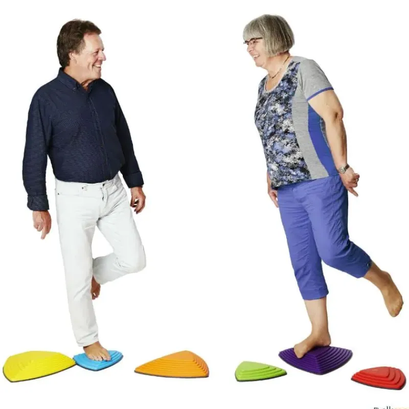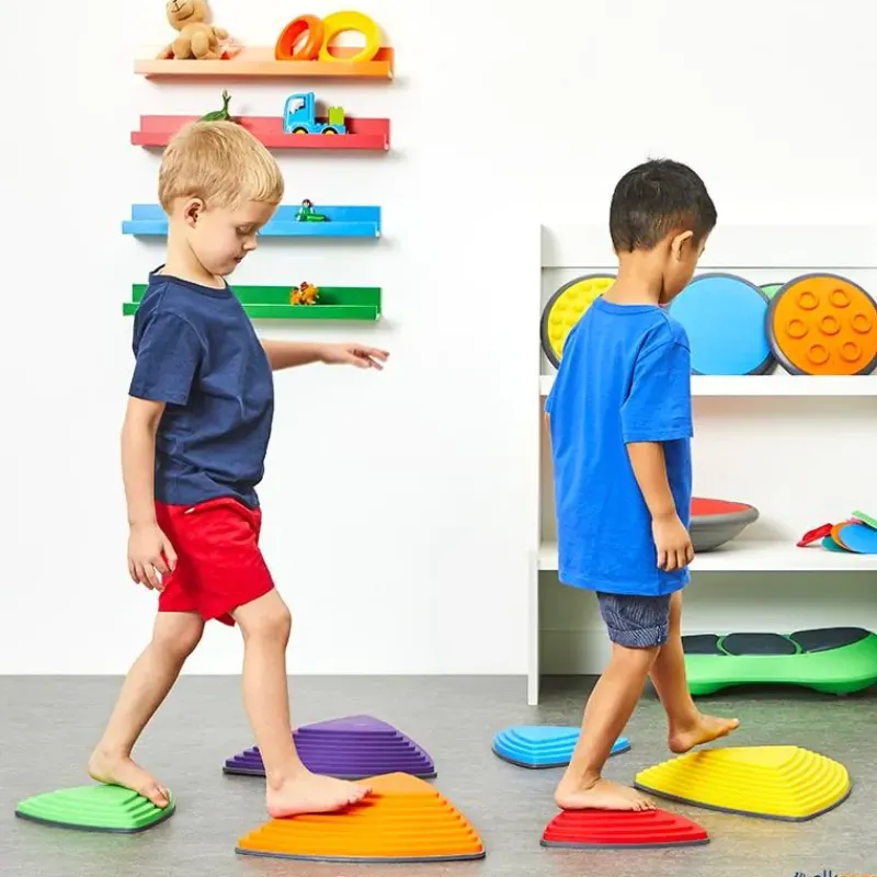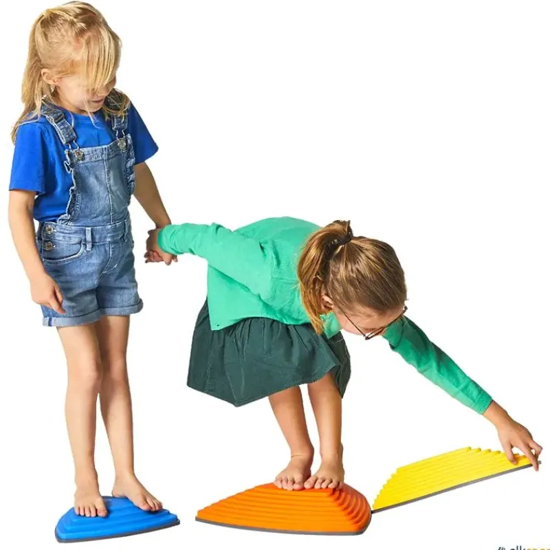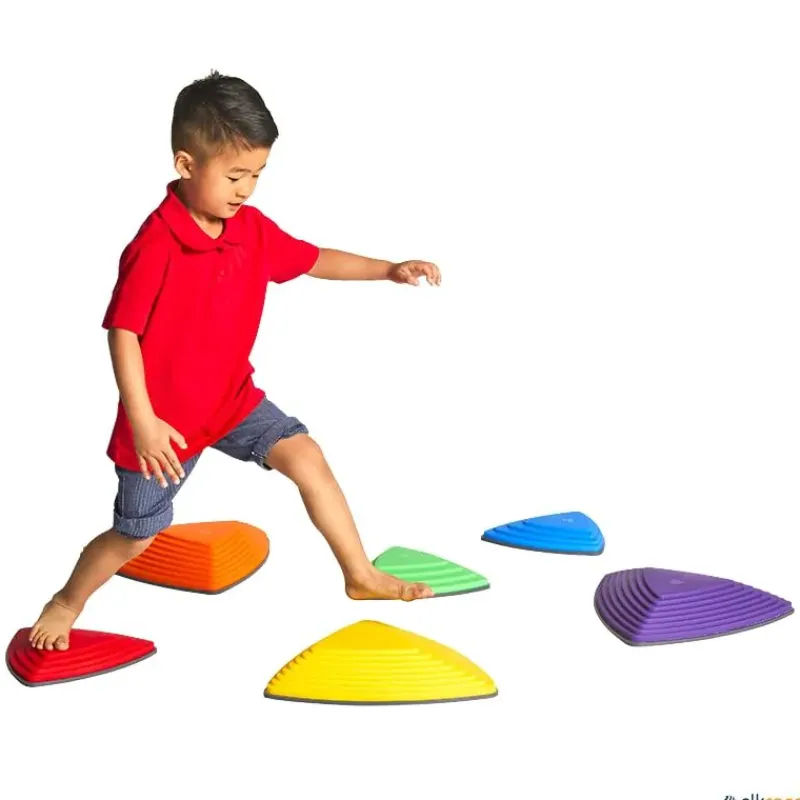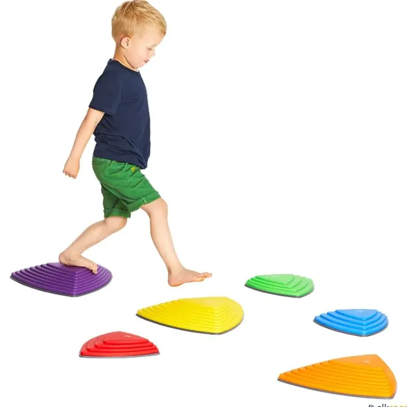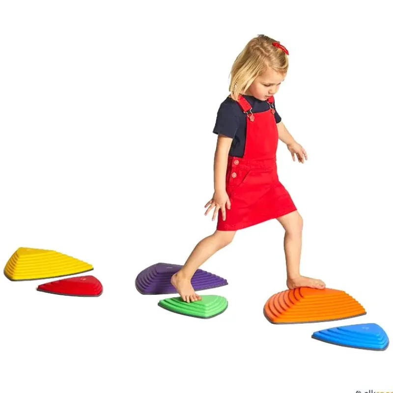 Sin duda la actividad que más entusiasma a los niños cuando van al río, es tratar de cruzarlo de piedra en piedra sin mojarse. Esto es lo que hemos tratado de trasladar a la escuela a través de este material. El objetivo es el mismo: tratar de saltar de piedra en piedra sin tocar el suelo. A partir de aquí se pueden diseñar todos los juegos y actividades que se quieran. El alumno trabajará coordinación, apreciación de distancias, controlará sus emociones y el miedo a saltar desde un lugar elevado a otro.