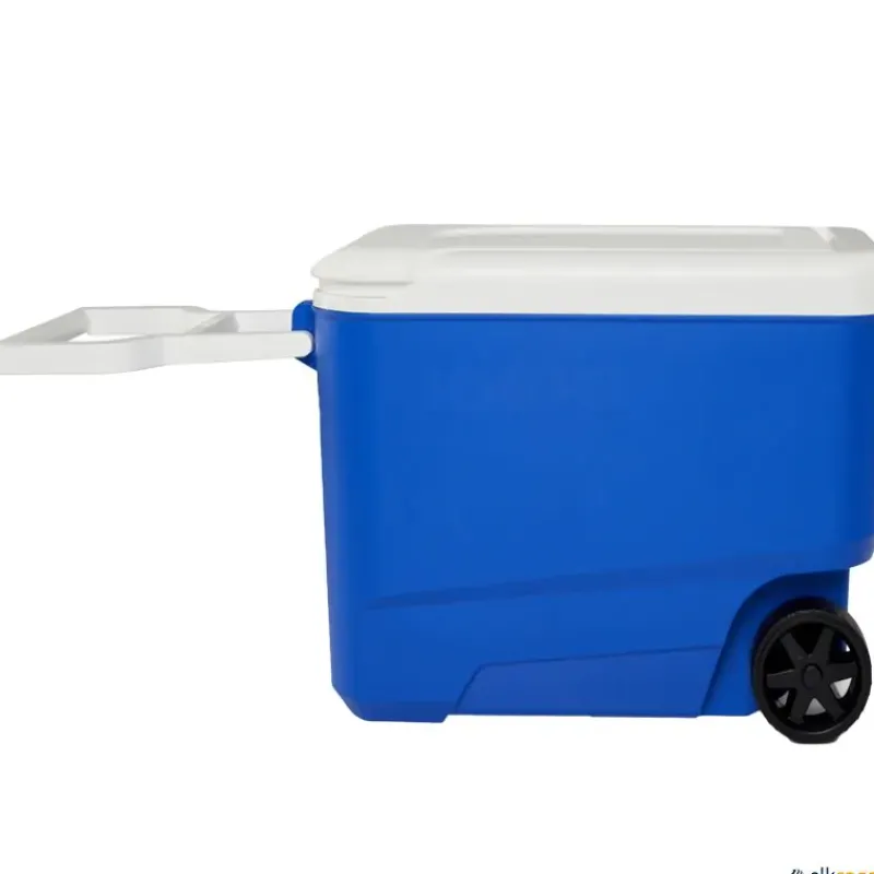 Nevera Wheelie cool de la marca Igloo con asa, ruedas y cámara térmica de 38 mm, llena de hielo y sin abrir pueden llegar a mantener el hielo varios días, aconsejamos meter la bebida ya preenfriada. Fabricada en USA.