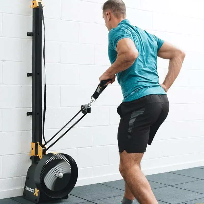 InerceX Wall Pulley es una máquina de acero para entrenamiento inercial, utilizando los agarres unidos a la polea, el usuario tira para acelerar el volante y luego se resiste para desacelerar el volante mientras la correa se enrolla en la otra dirección.