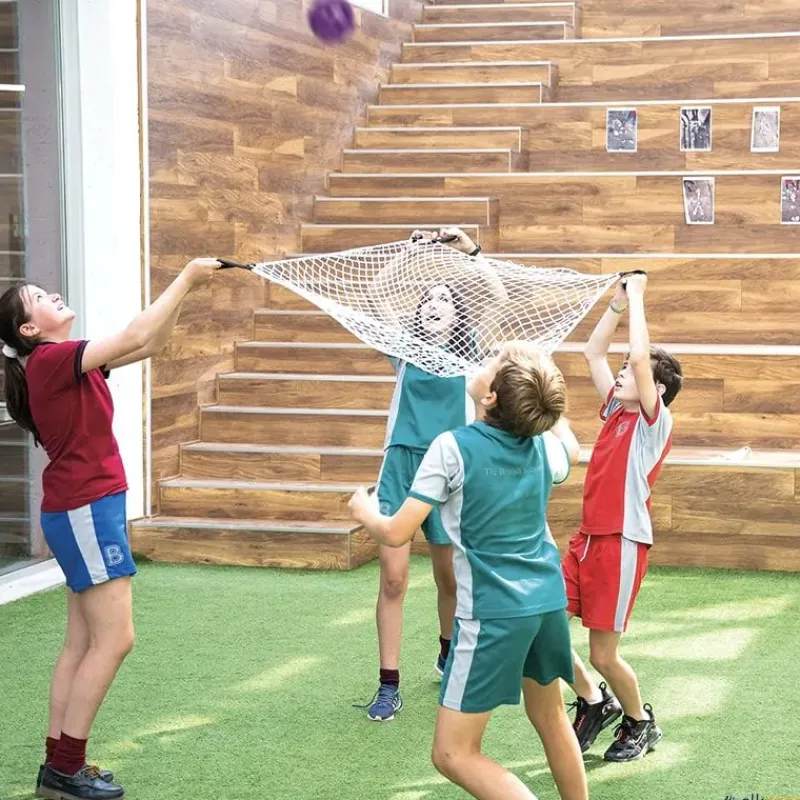 El juego de la red es un juego cooperativo (de 2 a 4 jugadores) en el que un equipo lanzan juntos una o varias pelotas al aire con la ayuda de una red. Estas pelotas deben ser recogidas en la red por el mismo equipo. Hace falta un movimiento coordinado del equipo para propulsar las pelotas en el aire y un esfuerzo todavía más coordinado para darles la trayectoria deseada. Pero estas acciones son mucho más fáciles con la red que con los paracaídas. El grupo deberá desplazarse a la vez y esforzarse en atrapar la bola lanzada. Cuanto más grande es el grupo, mayor será este esfuerzo de coordinación.