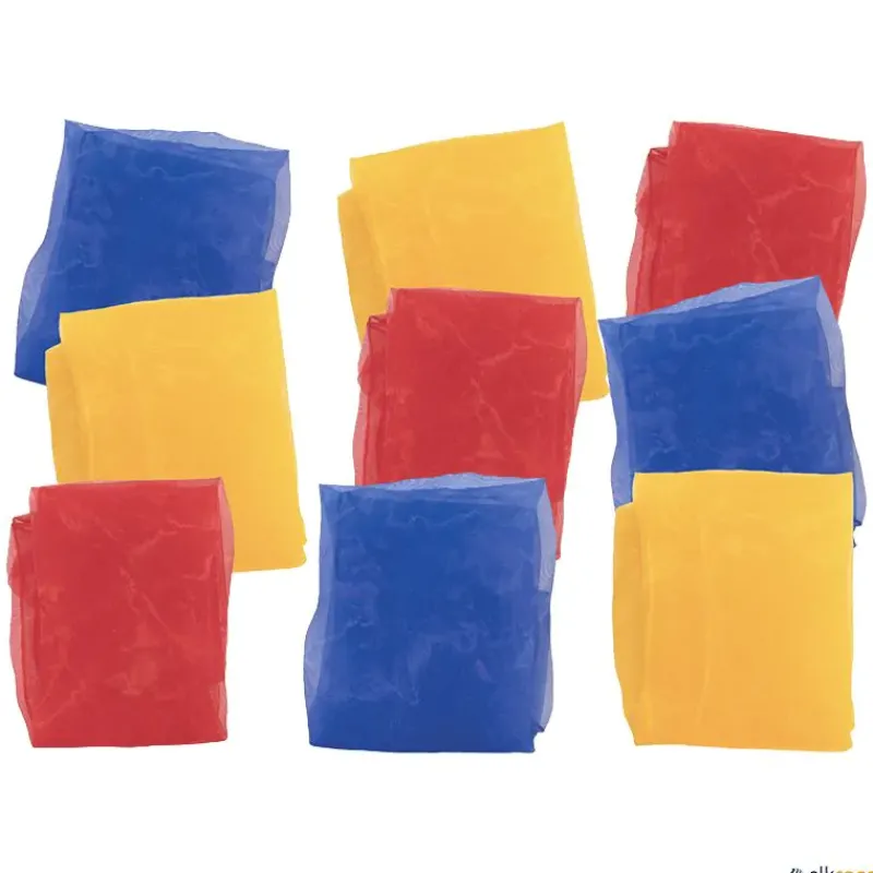 · 9 Pañuelos malabares (3 conjuntos de 3 pañuelos).