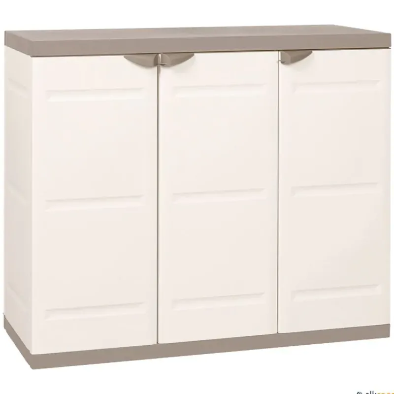 Medio armario de 3 puertas con estantes fabricado en resinas plásticas de alta calidad. Robusto, resistente a ambientes húmedos. Montaje sencillo sin herramientas. Con posibilidad de cierre con candado (candado no incluido).
