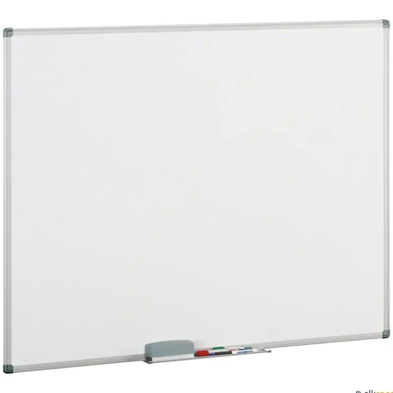 Pizarra para pared con marco de aluminio, cantoneras decorativas y superficie estratificada para rotuladores especiales. Con cajetín de alumino de 40 cm y elementos de fijación. Se pueden instalar de forma horizontal o vertical. Reciclables 100%, y certificadas según normas UNE EN 14434:2010 y UNE 11016:89. Para proyección, se recomienda su uso con un proyector de corto alcance para evitar los reflejos en la superficie.