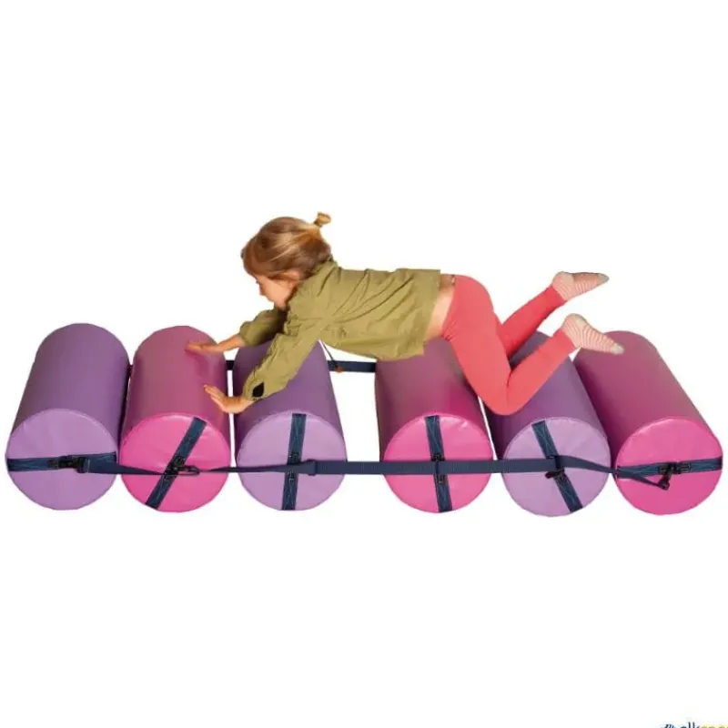 Conjunto de 6 rodillos de espuma forrada unidos por cintas laterales con enganches. La cinta se puede soltar para usar los cilindros por separado.