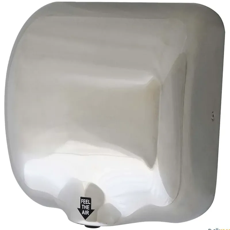 Secador de manos automático fabricado en acero inoxidable, con una velocidad de aire de 90 m/s y certificado IPX1 de protección contra la humedad.