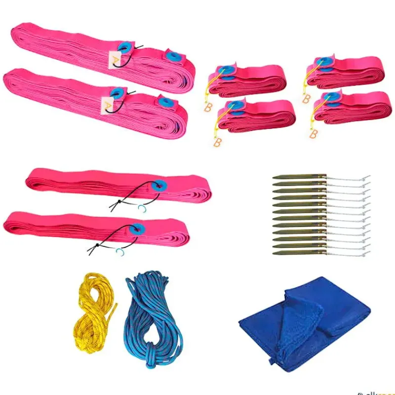 3 – La longitud de la ‘long line A’ es de 21 metros y las líneas deben estirarse hasta la longitud requerida de 27 metros. Para facilitar esto encontrará las cuerdas de medida incluidas (en la cuerda de 27 metros suministrada, los 6 metros y 12 metros están indicados con cinta adhesiva roja. Así que tienes que hacer dos pasos al instalar la ‘long line A’: primero estirar la banda hasta los 27 metros y luego ajustar el orificio de fijación a los 6 metros y 12 metros exactamente y colocar las estacas en el suelo.