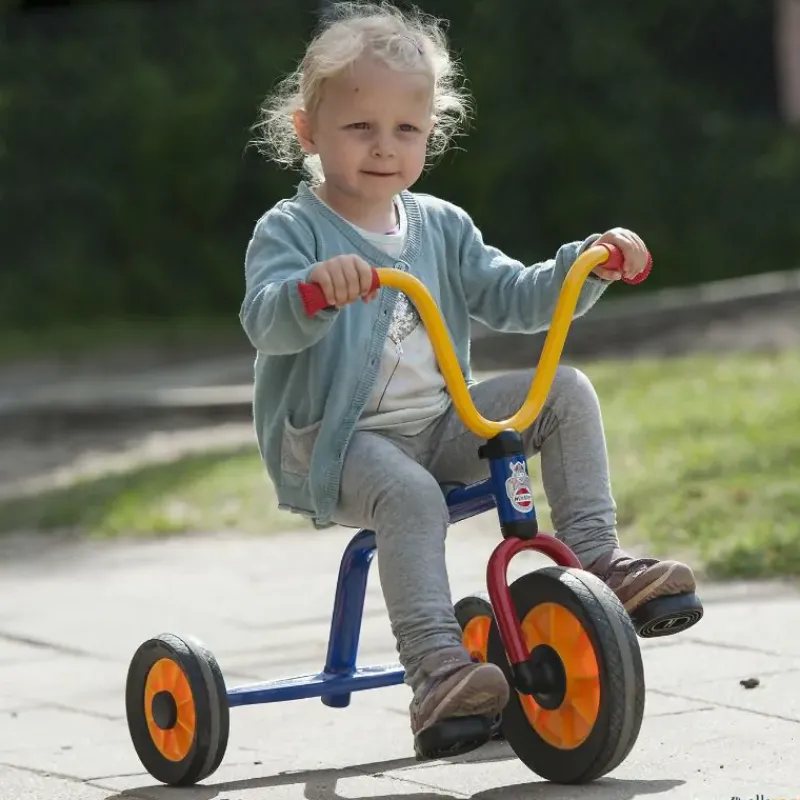 Clásico triciclo para niños con plataforma para los pies, en la parte posterior y asiento ajustable.